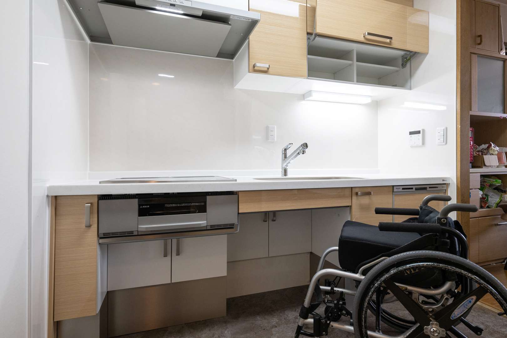 使いやすさ:シンクやコンロの高さを調整し、座ったままでも作業ができるようにする。