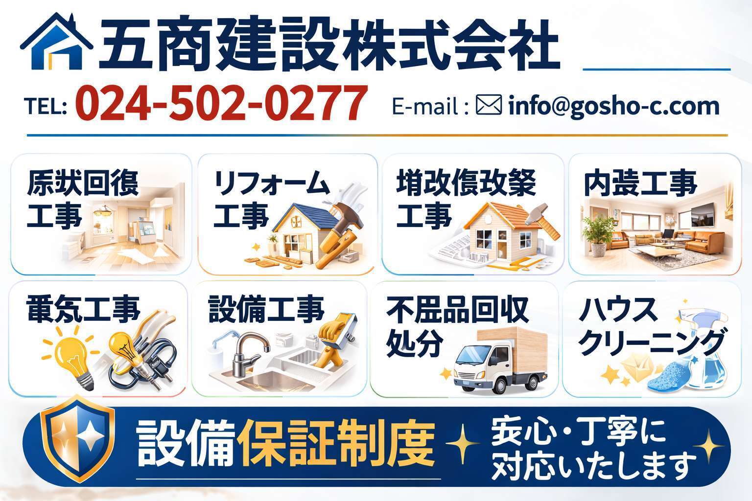 五商建設株式会社の「取扱商品(サービス)」は、公式情報から整理すると 建設業・生活サポート・清掃・便利屋業務まで幅広い“総合サービス” を提供しているのが特徴です。以下に、検索で確認できた内容を体系的にまとめるね。