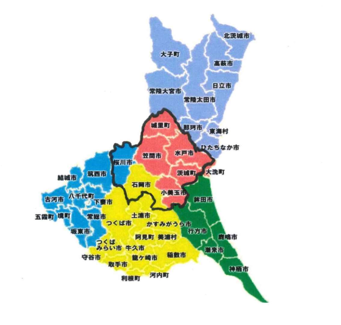 石岡市 潮來市 稲敷郡阿見町 稲敷郡河内町 稲敷郡美浦村 稲敷市 牛久市 小美玉市 笠間市 鹿嶋市 かすみがうら市 神栖市 北茨城市 北相馬郡利根町 久慈郡大子町 古河市 桜川市 猿島郡五霞町 猿島郡境町 下妻市 常総市 高萩市 筑西市 つくば市 つくばみらい市 土浦市 取手市 那珂郡東海村 那珂市 行方市 坂東市 東茨城郡茨城町 東茨城郡大洗町 東茨城郡城里町 常陸太田市 常陸大宮市 日立市 ひたちなか市 鉾田市 水戸市 守谷市 結城郡八千代町 結城市 龍ヶ崎市